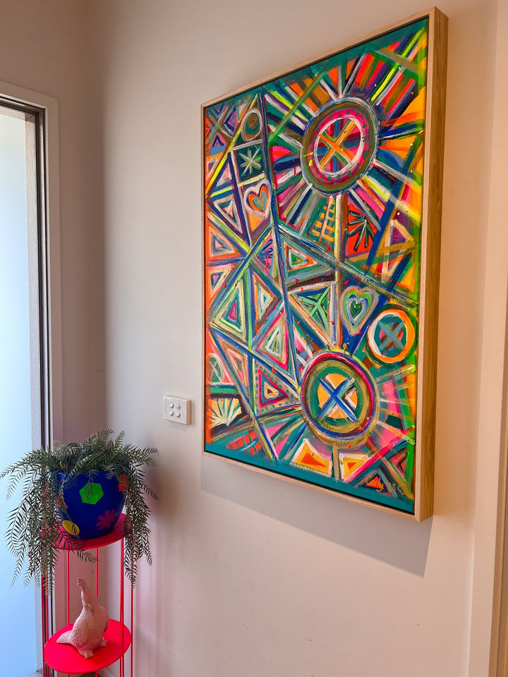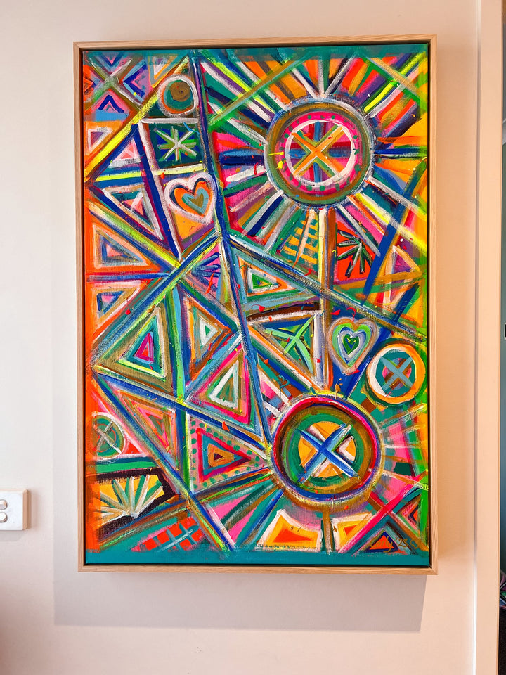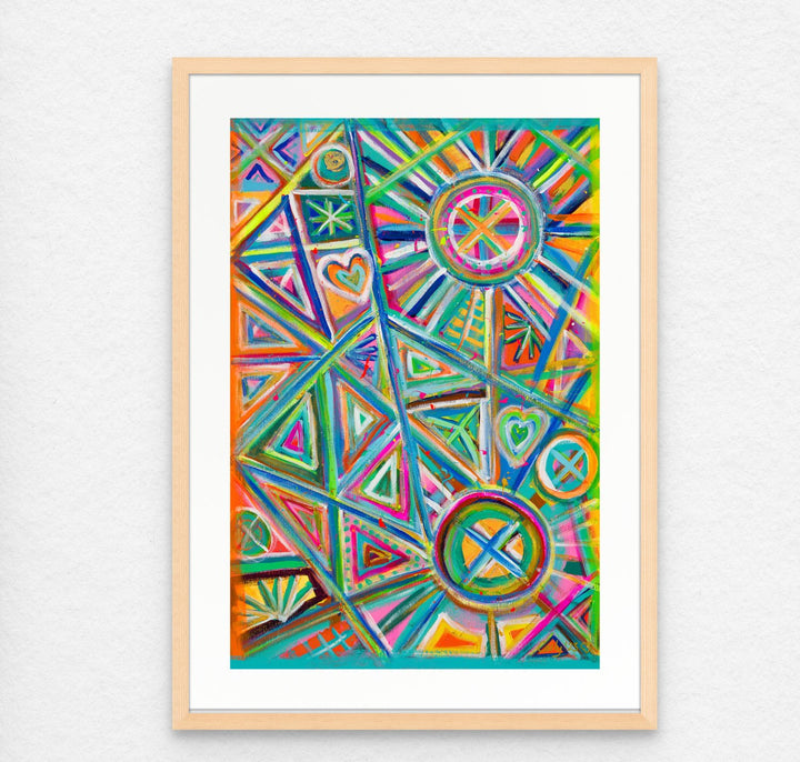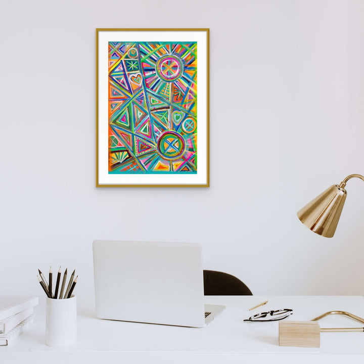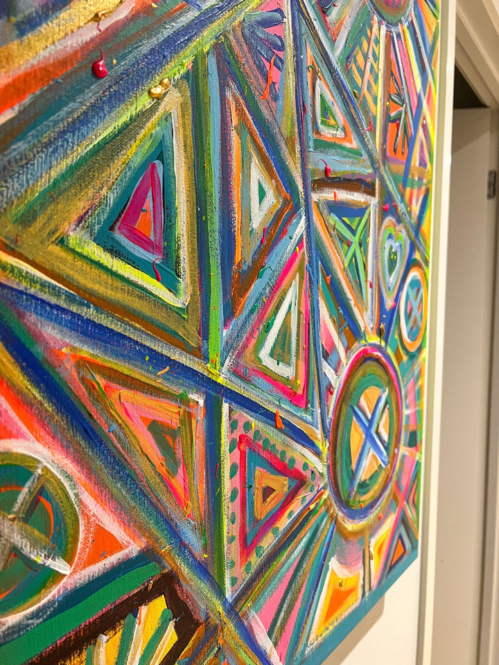 Geometric Rainbow is an eye-catching abstract artwork that bursts with energy and movement. With its bold, vibrant colours, it brings together lines, shapes, circles, and stripes in a playful and dynamic way. The splatter art adds a touch of spontaneity, reminding us that sometimes, imperfection is what makes things truly perfect.