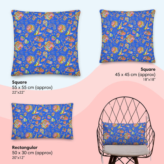 Cool off and brighten up with the Blue Summer Sorbet Cushion! With its vibrant blue backdrop and fun cut-outs of suns, sunglasses, flowers, and ice creams, this cushion is a lively addition to any space. Whether you're looking for a cheerful couch cushion, a pop of fun with a sofa cushion, or a statement rectangle cushion to liven up your favourite chair, this design brings a burst of energy.