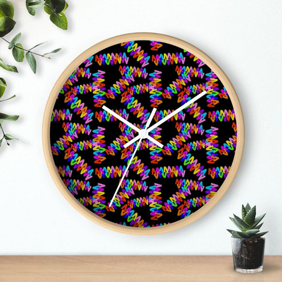Make a bold statement with the Electric Zigzag Wall Clock! This modern wall clock is designed to catch the eye with its rainbow zigzag pattern that instantly adds style to any room. Choose from a white, black, or wooden frame to match your space, and pair it with crisp white hands for a sleek finish. The dial is simple, but you can customise it with hour separation lines or numbers for easier reading. With its silent wall clock mechanism, you can enjoy a quiet, peaceful space free from ticking sounds. The analogue wall clock face makes it easy to tell the time, and the pre-installed backside hook ensures a quick and easy hang.