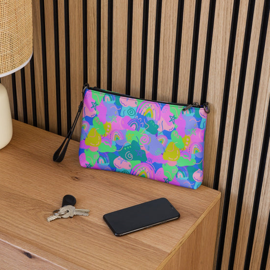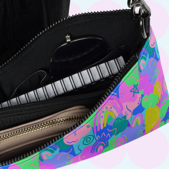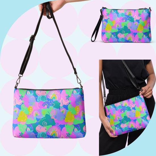The Funfetti Three-in-One Bag is a colourful bag made to spread joy! A vibrant mix of stars, rainbows, squiggles, and abstract shapes in bold shades of green, pink, and blue gives this bag a fun and energetic look. Whether you're dressing up or keeping it casual, this bag is ready to add a pop of colour to any outfit.