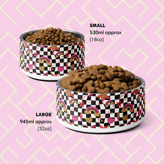 Give your pet’s meals some cosmic energy with the Galaxy Pet Bowl! Featuring a bold checkerboard background filled with glittering stars, rainbows, hearts, and lightning bolts, this cute pet bowl is perfect for pets who love making a statement. Whether your dog is racing to their bowl like it’s the speed of light or your cat is delicately investigating every bite, this bowl is ready for all eating styles.