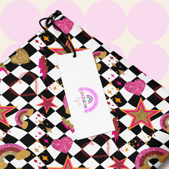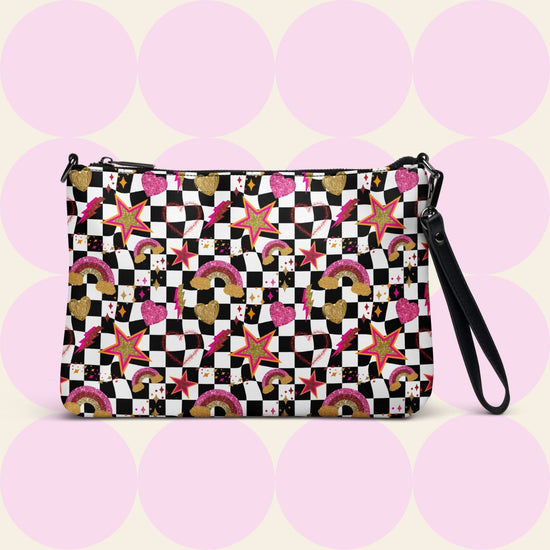 The Galaxy Crossbody Bag is where classic meets cosmic! With a black and white checkered background and glittery pops of gold, pink, and red in rainbows, stars, and hearts, this bag is a bold mix of retro and celestial magic. Whether you’re dressing up or keeping it casual, this colourful bag is ready to shine. Wear it as a clutch bag for women for a sleek look, rock it as a handbag for everyday flair, or go hands-free with a crossbody bag when you're on the move.