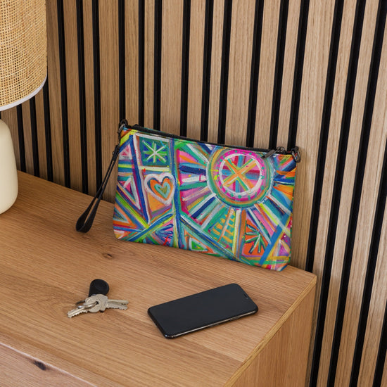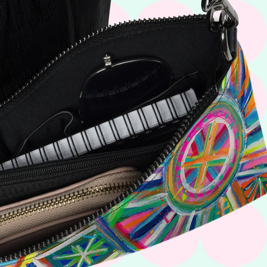 The Geometric Rainbow Three-in-One Bag is a colour lover’s dream! With my Geometric Rainbow painting bringing bold shapes and vibrant hues together, this rainbow bag is anything but ordinary. One bag, three ways—carry it as a clutch bag for women, throw it over your shoulder as a handbag, or wear it hands-free as a crossbody bag. The choice is yours!