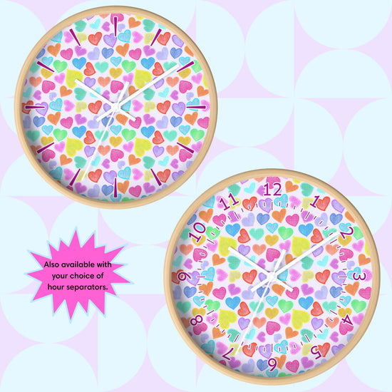 Add a little love to your space with the Heart Attack Wall Clock! Featuring vibrant hand-drawn hearts in rainbow colours, this modern wall clock is sure to brighten up any room and keep you on time—no matter what your heart is up to!