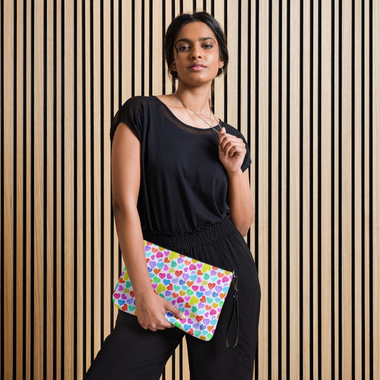 The Heart Attack Three-in-One Crossbody Bag is a colourful bag made for those who love to wear their heart on their sleeve—literally! Covered in multi-coloured hand-drawn hearts on a light background, it’s a rainbow bag that’s impossible to ignore. Whether you're crushing on a clutch bag for women, falling for a handbag, or swooning over a crossbody bag, this beauty lets you switch things up in a heartbeat—just adjust or remove the wrist and shoulder straps to match your style.