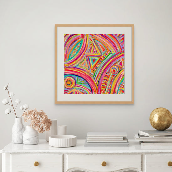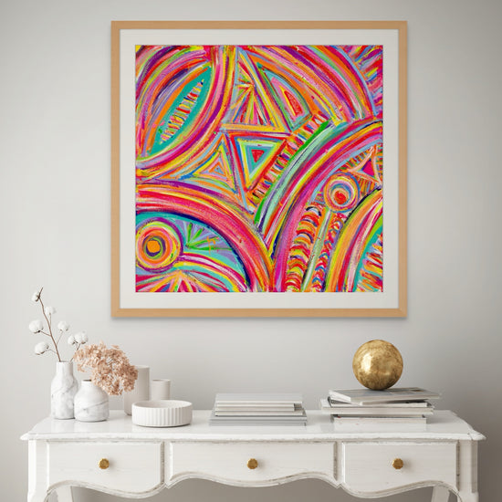 Add vibrant, colourful art to your home or business with the Karma Kaleidoscope Fine Art Print. This high-quality reproduction of my 2024 Karma Kaleidoscope painting, painted by Melbourne artist Carly Wood (that's me!), brings together geometric patterns and vivid colours that make a bold statement. Printed on premium Ilford Galerie Textured Cotton Rag 310gsm, this fine art giclee print preserves the depth, texture, and intricate details of the original acrylic on canvas artwork, offering an authentic feel.