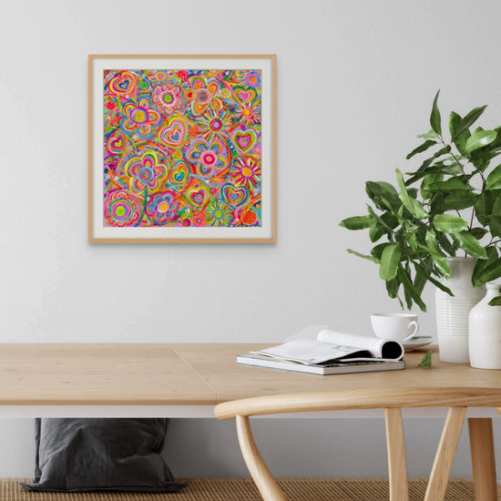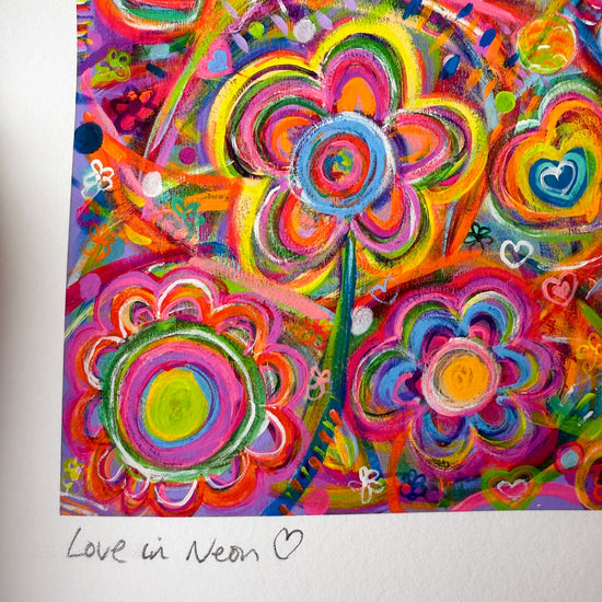 Bring a burst of vibrant colour and energy into your space with the Love in Neon Fine Art Print. This professional reproduction of my 2024 painting, Love in Neon, captures the bold neon hues and dynamic geometric patterns of the original artwork.