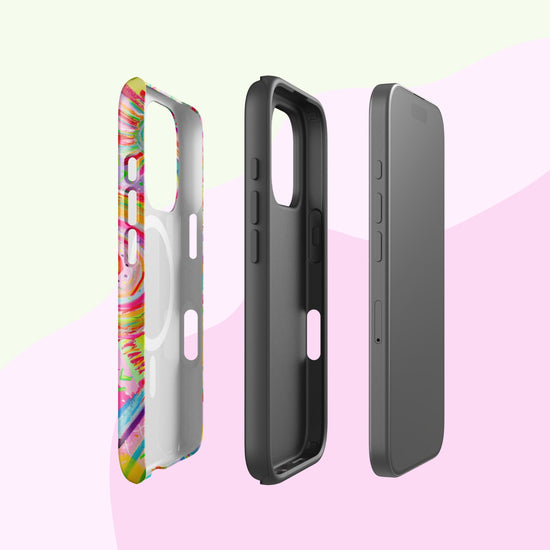 The Summer Sorbet iPhone Case is a feast for the eyes, packed with energy and colour! Inspired by fresh, fruity tones, this colourful phone case blends bright citrus hues, organic shapes, and layered abstract forms. Neon bursts and metallic accents create a dynamic composition, making this the perfect Apple iPhone case for colour lovers.