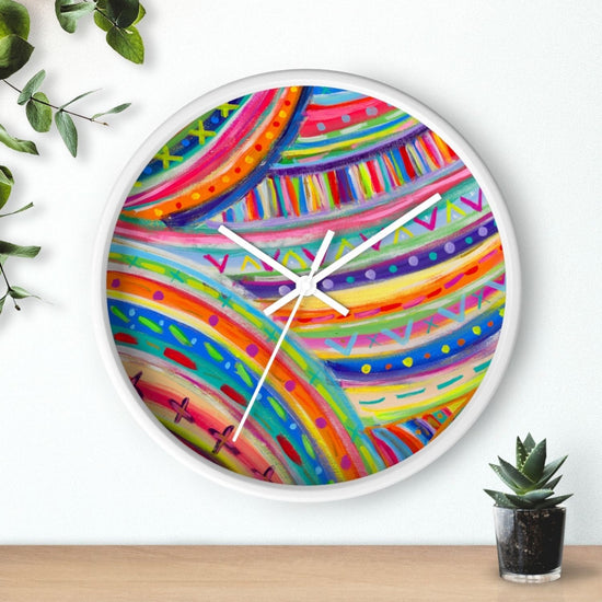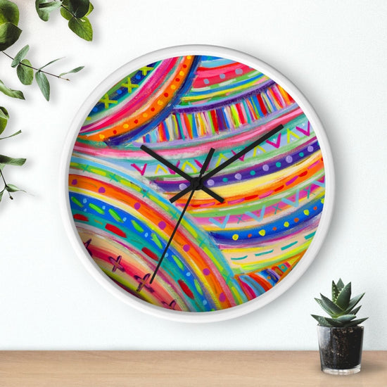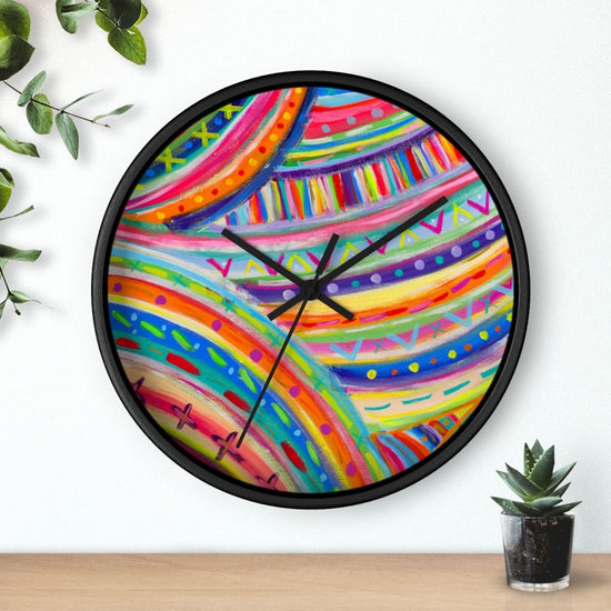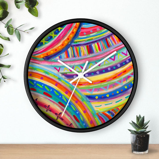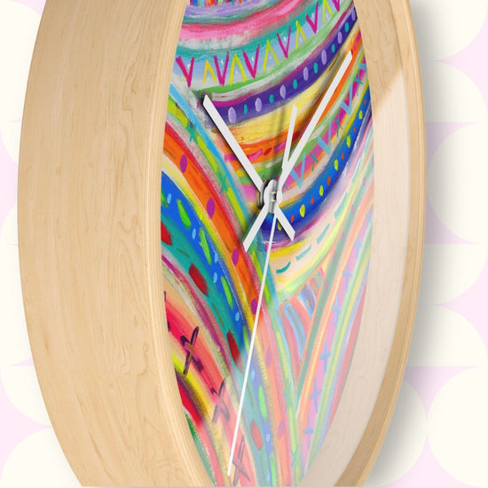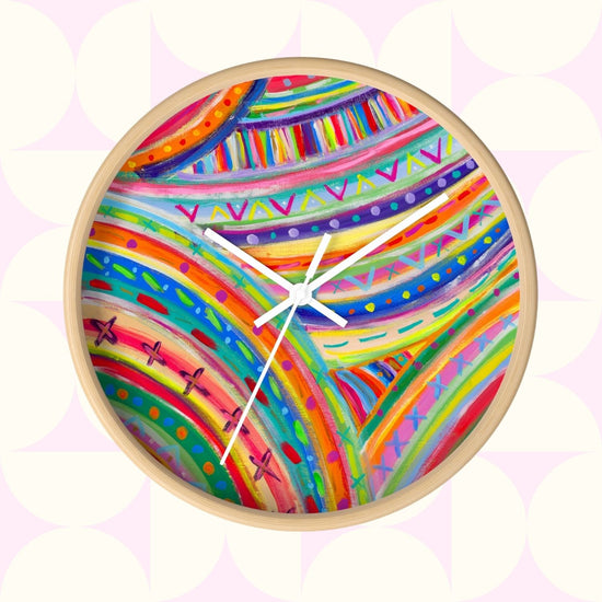 Brighten up your space with the Rainbow Connection Wall Clock! Featuring my vibrant Rainbow Connection painting, this modern wall clock brings a burst of colour to your walls. Packed with playful patterns and bold hues, it's the perfect way to keep time in a fun, energetic way. Whether you choose a wooden wall clock, white wall clock, or black wall clock, this timepiece will not only keep you on track but also bring personality to any room!